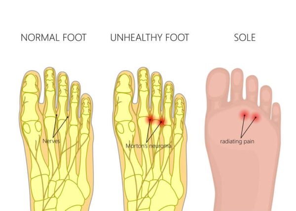 Morton’s Neuroma, simply put, is where a nerve in your foot is injured or damaged. It more often causes pain in the ball of the foot; especially, between the third and fourth toes.