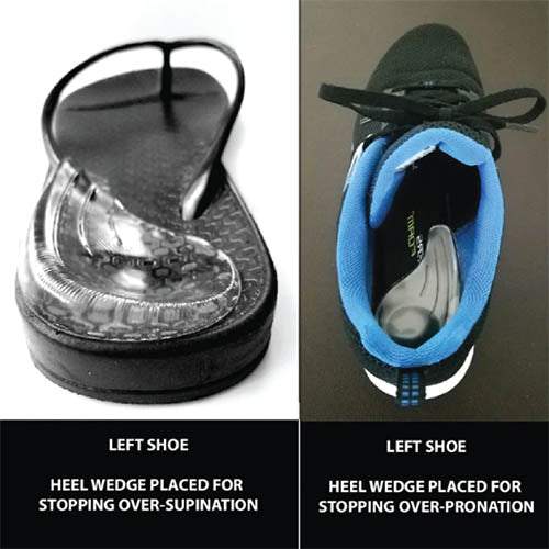 Place the heel wedges with the thicker edge on the inside (medial edge) to stop over pronation.